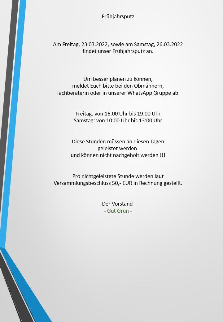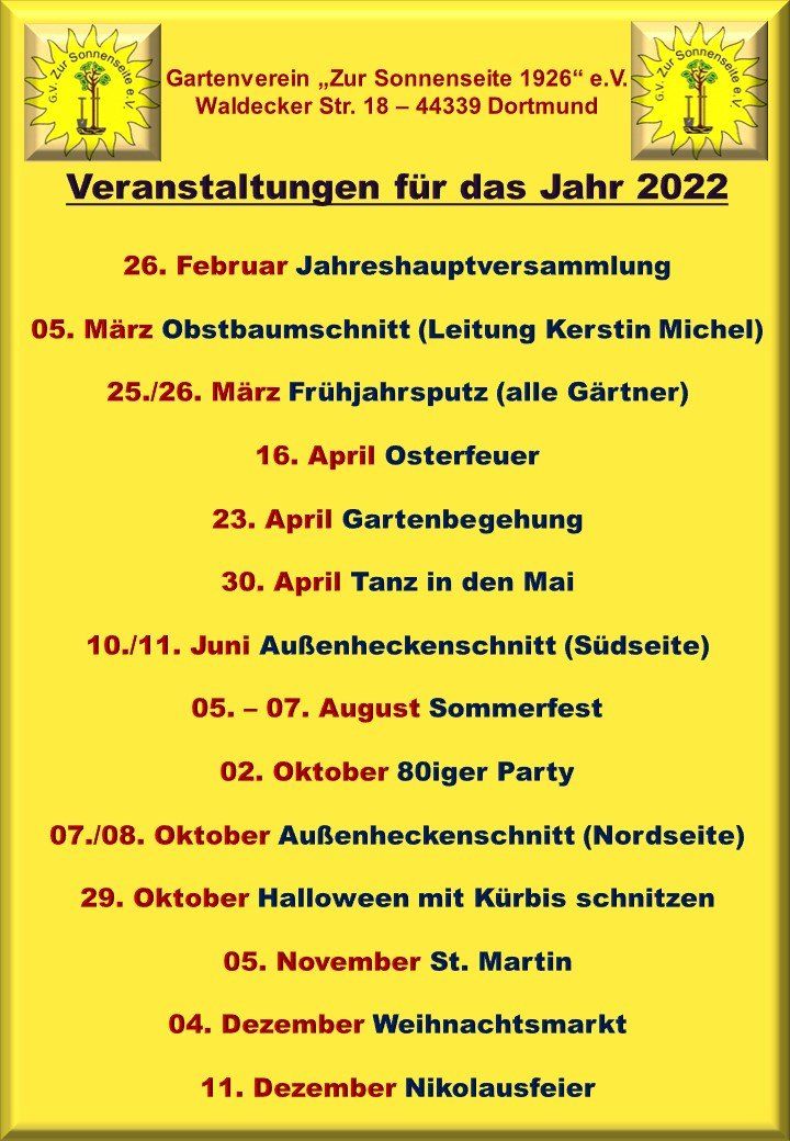 Der Gartenverein Zur Sonnenseite e. V. lud am 06.11.2022 zu einer Mitgliederversammlung ein. Auf der Tagesordnung standen u. a. die Themen Strompreisentwicklung, Abrechnung der Frischwasserversorgung, Neuregelung der Gemeinschaftsstunden ab 01.01.2023 sowie Informationen über geplante Veranstaltungen im kommenden Jahr und Hinweise zur Anmeldung des Newsletters beim Landesverband Westfalen und Lippe der Kleingärtner e. V.